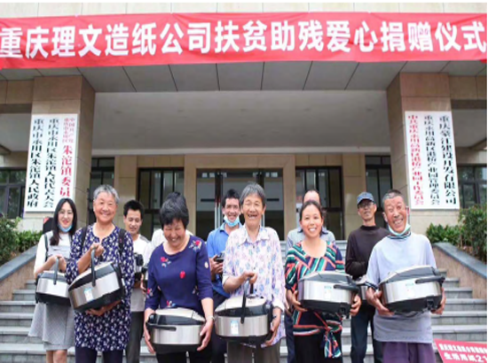 2020年5月8日,區(qū)殘聯(lián)在朱沱鎮(zhèn)政府舉行“重慶理文造紙公司扶貧助殘愛心捐贈儀式”。儀式現(xiàn)場,重慶理文向朱沱鎮(zhèn)、何埂鎮(zhèn)、臨江鎮(zhèn)、松溉鎮(zhèn)等4個鎮(zhèn)的1284戶建檔立卡貧困戶捐贈了價值 6 萬余元的生活用紙共計(jì) 1284 件。同時,區(qū)殘聯(lián)向 20 戶建檔立卡殘疾人家庭發(fā)放了電飯煲。