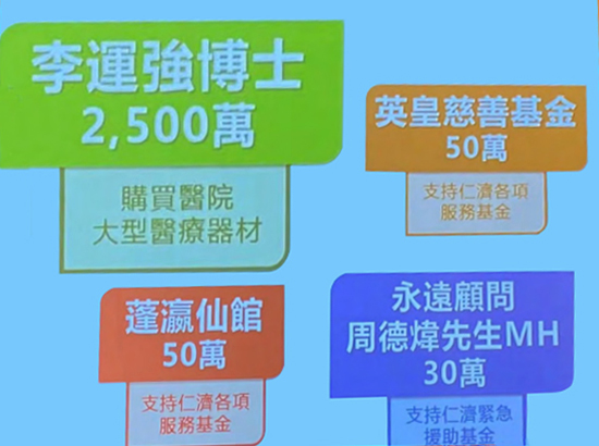 2021年4月 21日,李運(yùn)強(qiáng)博士樂捐港幣二千五百萬元予香港仁濟(jì)醫(yī)院,以購置大型醫(yī)療器材,借此可以造福廣大市民。李文俊先生及李文斌先生亦曾先后出任仁濟(jì)醫(yī)院的主席,貫徹李家乃積善之家、服務(wù)社會的家風(fēng)。