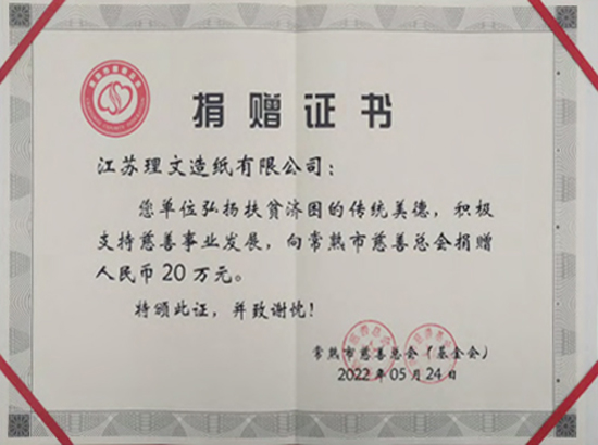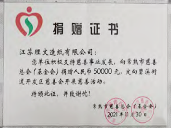 2021年11月,江蘇理文造紙有限公司相關(guān)負(fù)責(zé)人代表公司向江蘇省常熟市慈善總會捐贈人民幣五萬元,定向用于開發(fā)區(qū)慈善會開展慈善活動。此舉也體現(xiàn)了公司勇于承擔(dān)社會責(zé)任,回饋社會的企業(yè)精神,捐贈得到了常熟開發(fā)區(qū)政府、常熟慈善總會的認(rèn)可,為此慈善總會向公司頒發(fā)了捐贈證書,以表彰我司在慈善事業(yè)上的突出貢獻(xiàn)及熱心捐助。